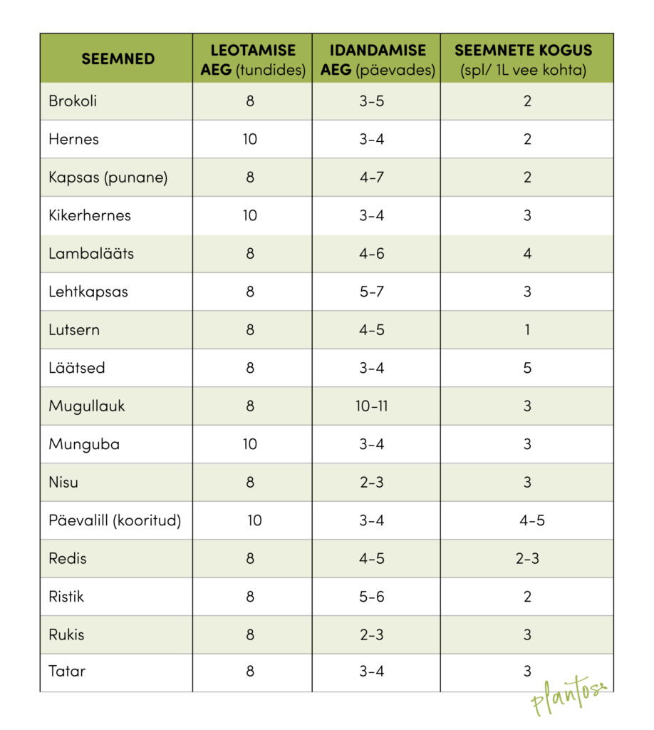 - Mõned idandid on valmis 2-3 päevaga, teistega läheb 5-6 päeva aega. Vaata allpool olevat tabelit, kust leiad täpsemad idanemisajad.