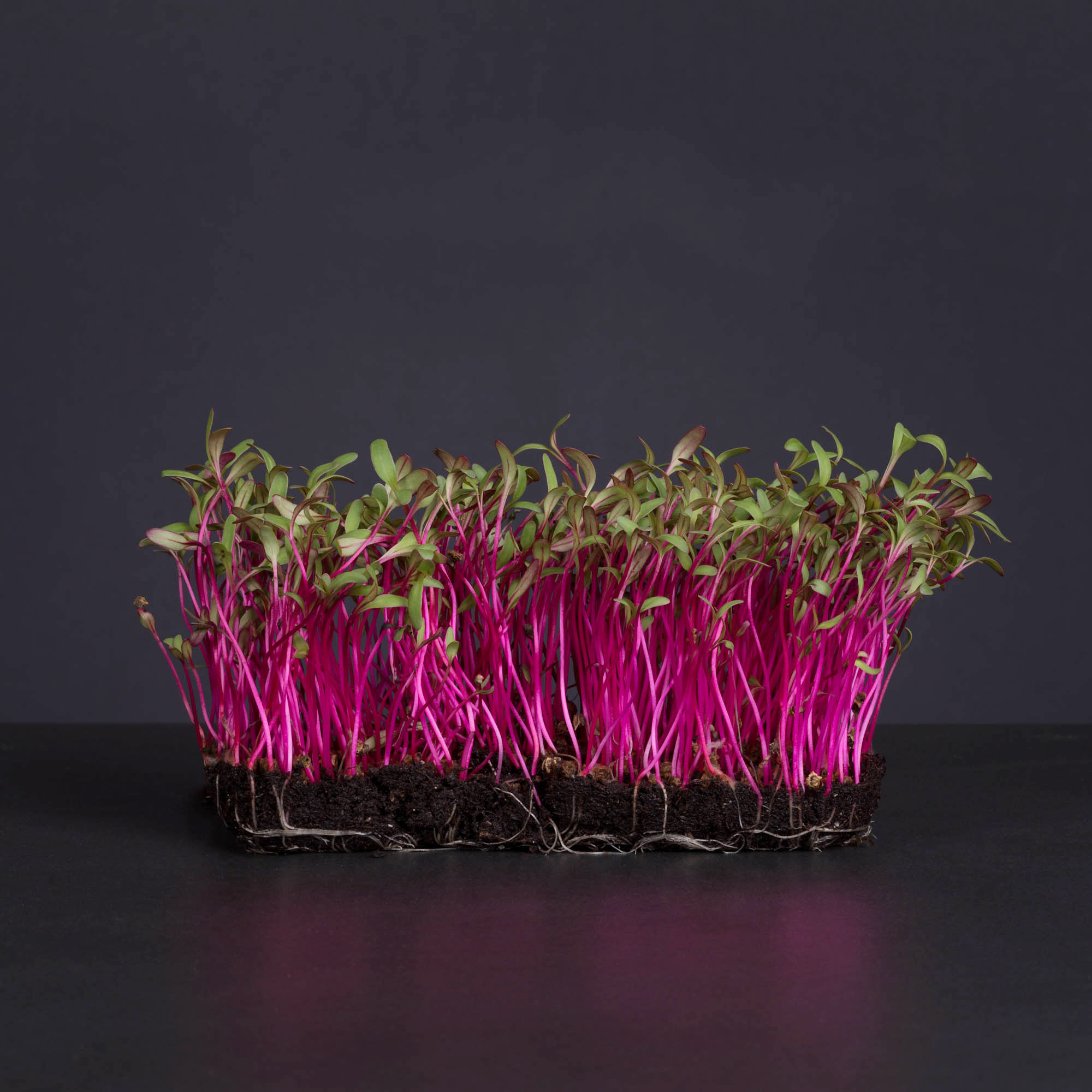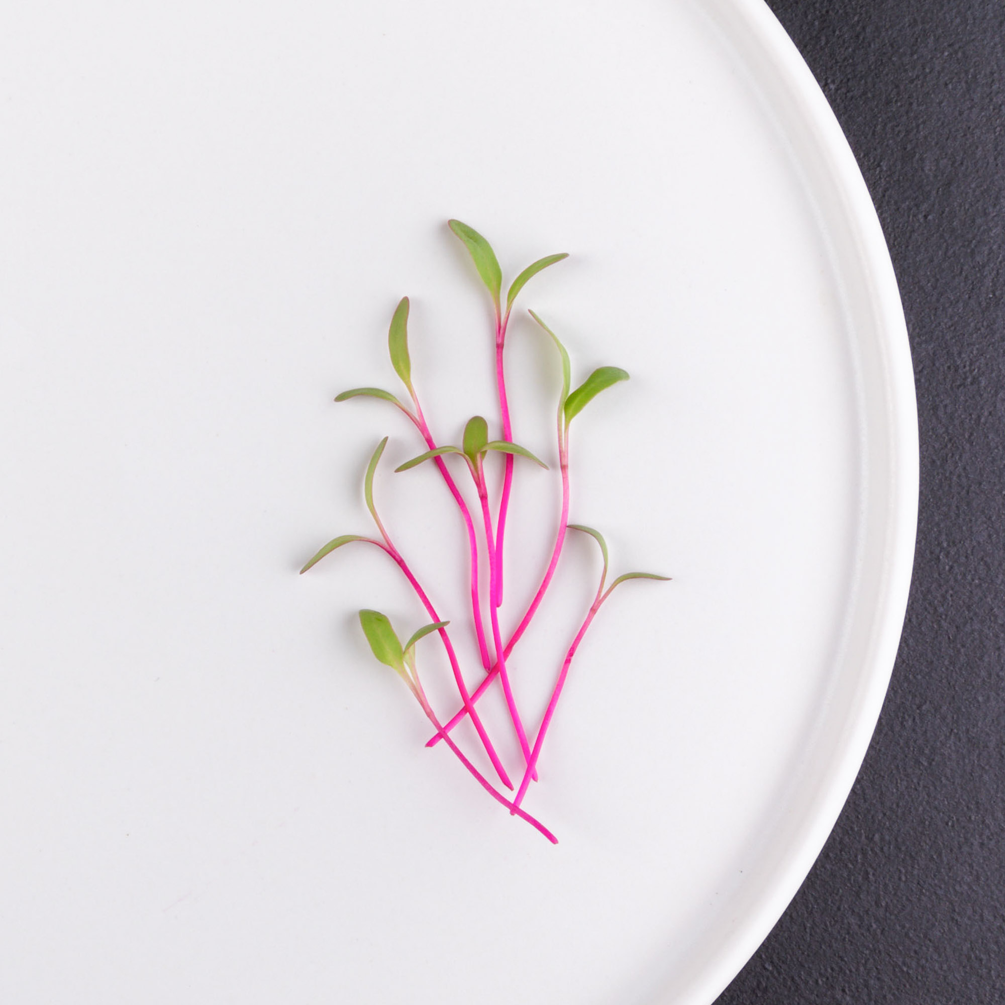 Beet microgreens have a crisp, juicy flavour with vivid pink stems and bright green leaves.