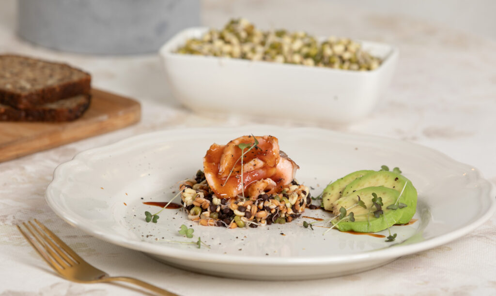 - Taldrikule võid värskust lisada ka särtsakate võrsetega. Meie kasutasime punase sinepi võrseid, mis sobivad hästi kalaga. Lisaks värskelt jahvatatud pipar ja soovi korral pigista peale värsket sidrunimahla.