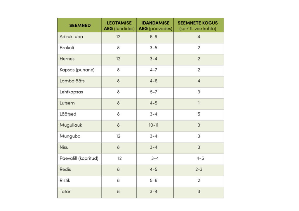 - Mõned idandid on valmis 2-3 päevaga, teistega läheb 5-6 päeva aega. Vaata allpool olevat tabelit, kust leiad täpsemad idanemisajad.