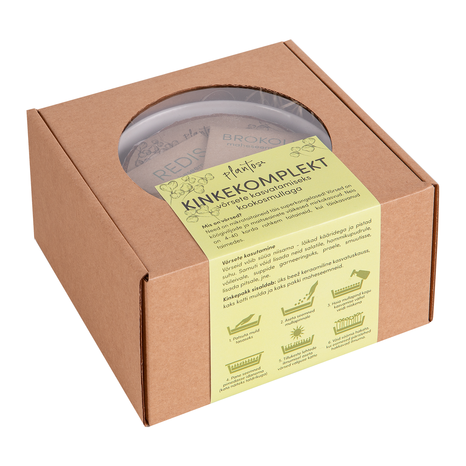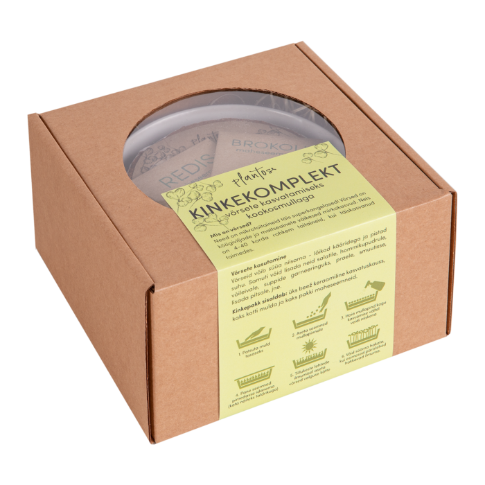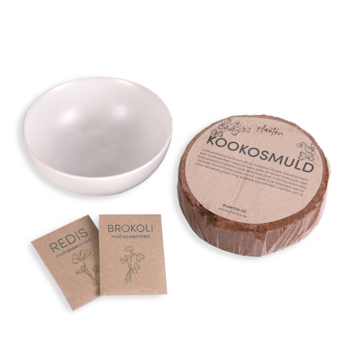 В набор входит одна многоразовая керамическая миска для выращивания. Помимо этого, в набор входит кокосовая почва для двух посевов, а также два сорта семян: редис и брокколи. Один подарочный набор позволяет сделать два посева.