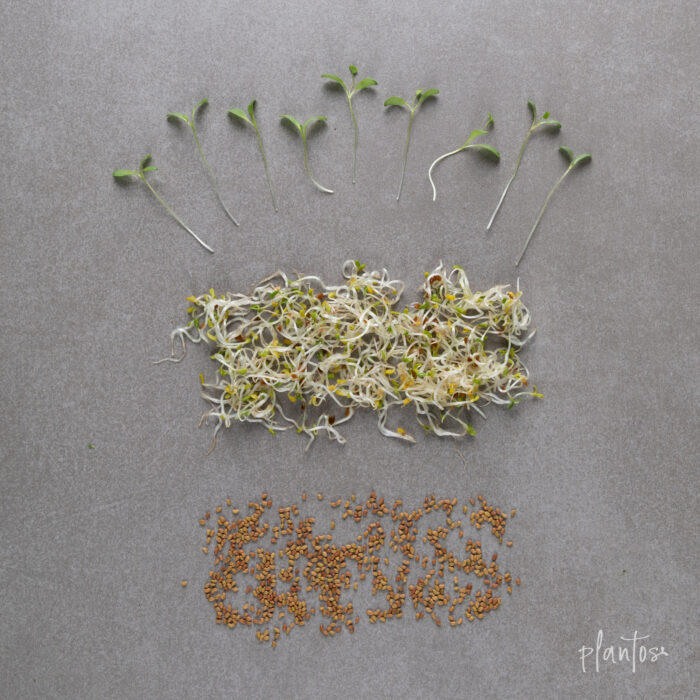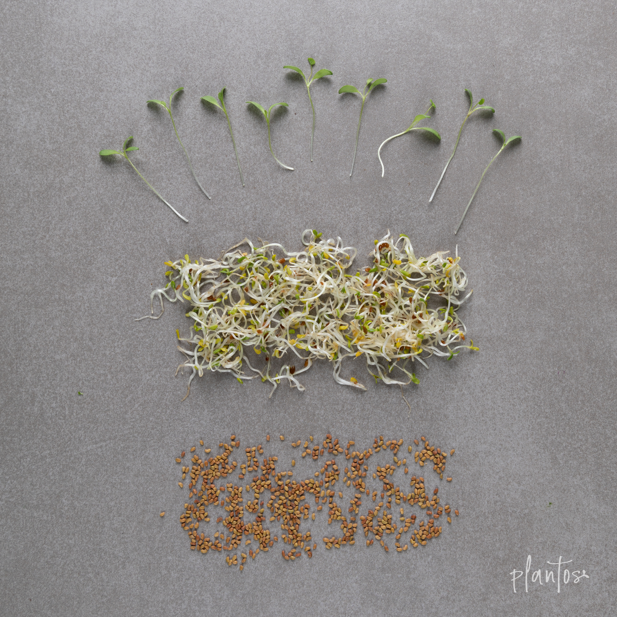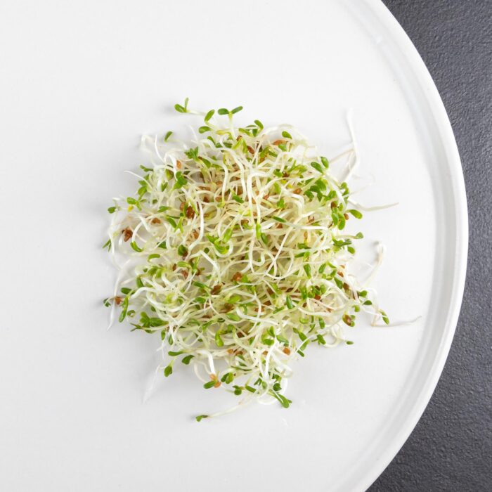 Полезные свойства: микрорастения люцерны содержат несколько биологически активных веществ и антиоксидантов,способствуют секреции ферментов, регулируют обмен веществ. Микрорастения люцерны помогают снизить риск рака молочной железы, сердечно-сосудистых заболеваний, артериосклероза и хорошо влияет на пищеварение. Микрорастения люцерны являются хорошими источниками пищи, содержащими сапонин Сапонин помогает понизить т.н. «плохой» холестерин, но не «хороший» HDL-холестерин. Сапонин также стимулирует иммунную систему, повышая активность естественных клеток-киллеров, таких как Т-лимфоциты и интерферон, и ускоряет регенерацию мертвых клеток и тканей. Люцерна содержит много растительных соединений, называемых фитоэстрогенами, которые химически схожи с гормоном эстрогеном. Фитоэстрогены противоречивы, но они могут иметь несколько преимуществ, включая облегчение симптомов менопаузы, вызванных снижением уровня эстрогена.
