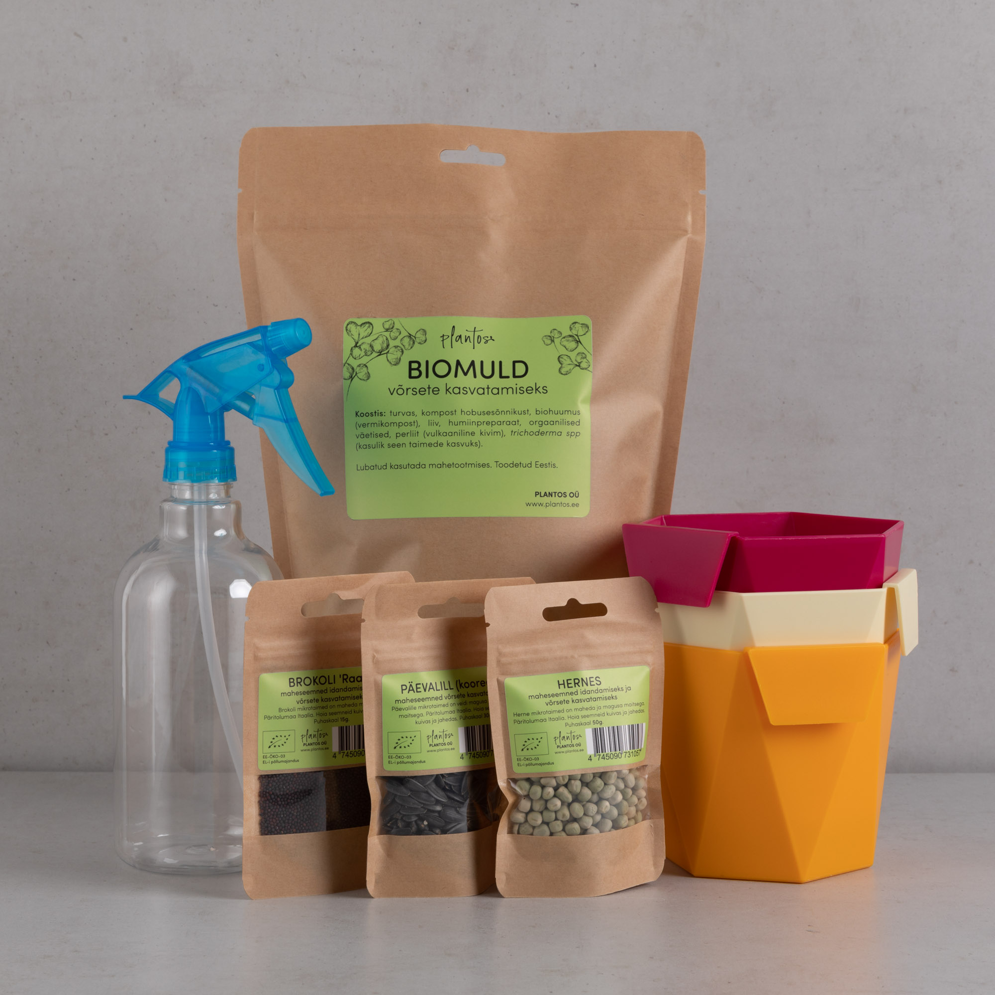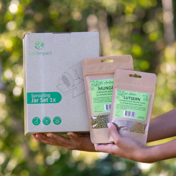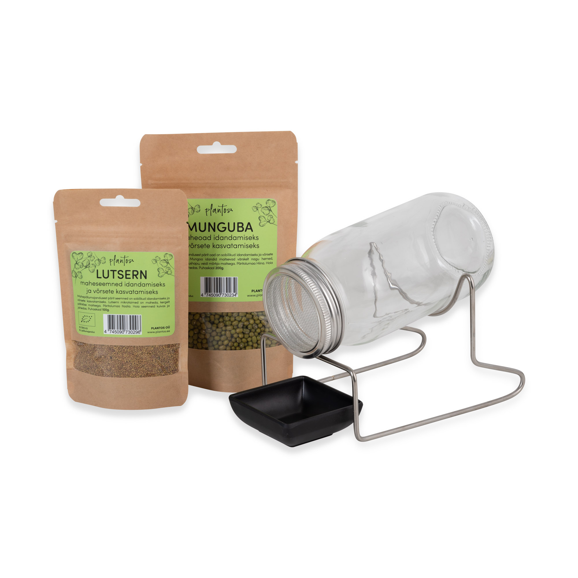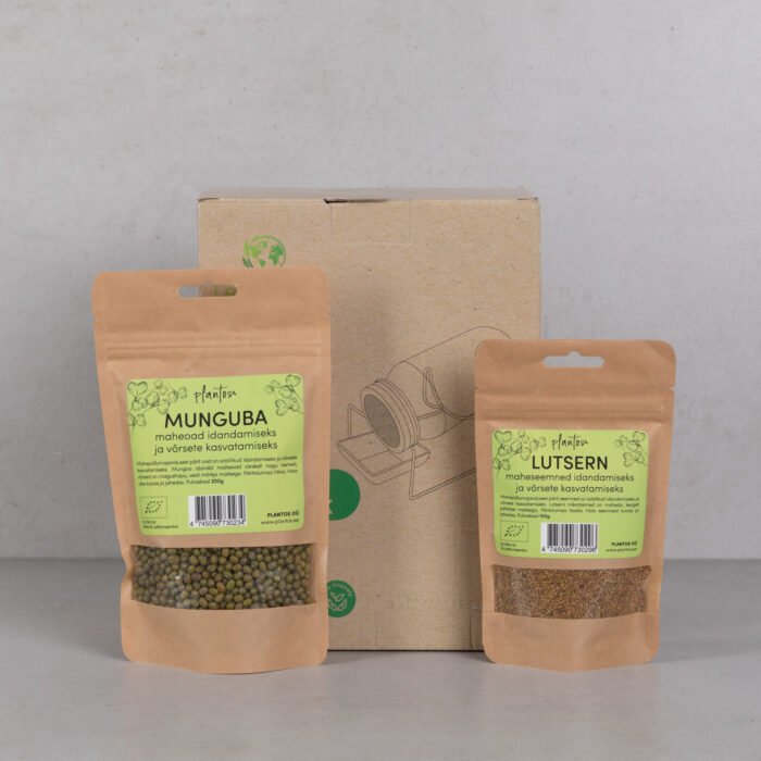 Idandamiskomplekt sisaldab idandamispurki koos alusega, 200g mungoa pakki ja 100g lutserni pakki.