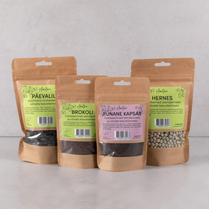 Kasvatuskomplektis on päevalill 150g, brokoli 100g, punane kapsas 100g, hernes 200g.