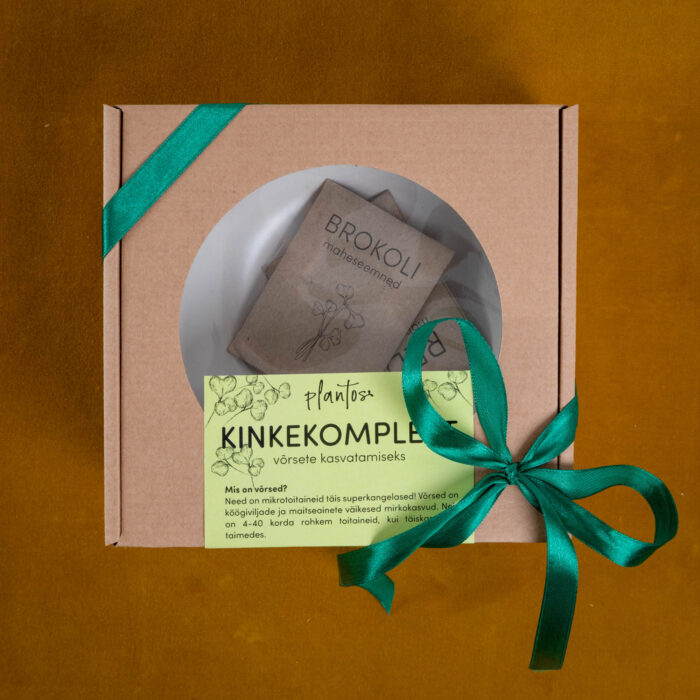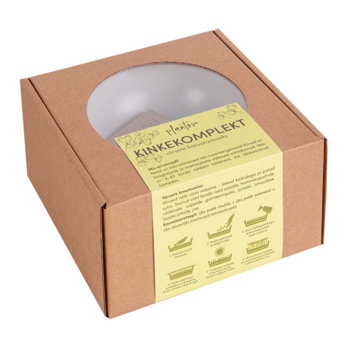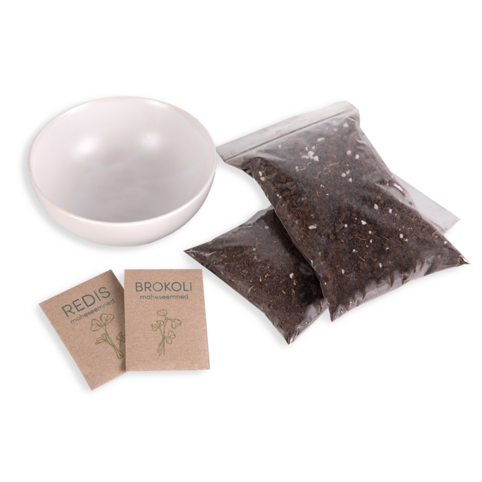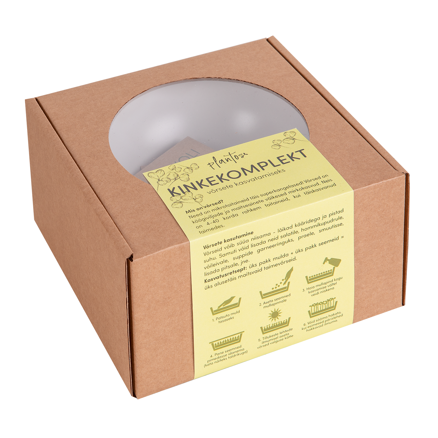 Komplektis on üks kasvatusalus, mida saad kasutada korduvalt. Lisaks on muld, millest järkub kaheks kasvatuskorraks ja kahte sorti seemneid: redis ja brokoli. Kokku saab ühest kinkekomplektist külvata kaks korda.