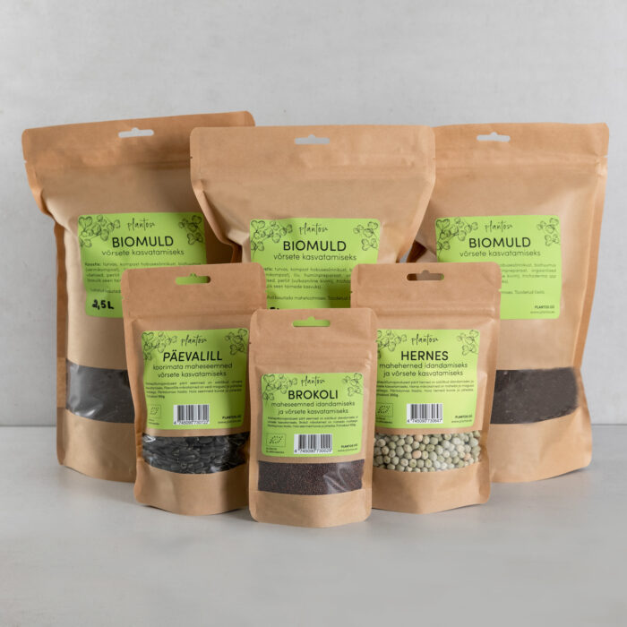Kasvatuskomplektis on 7,5l mulda, päevalill 150g, brokoli 100g, hernes 200g.