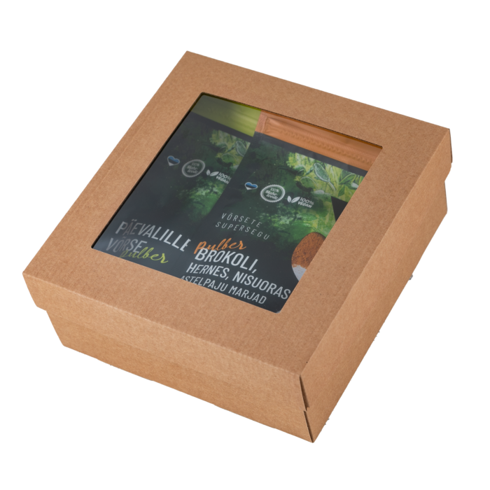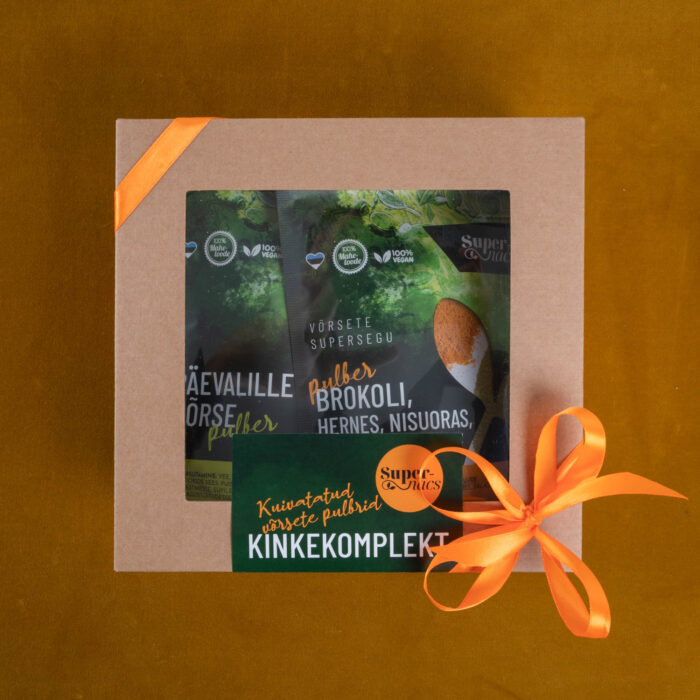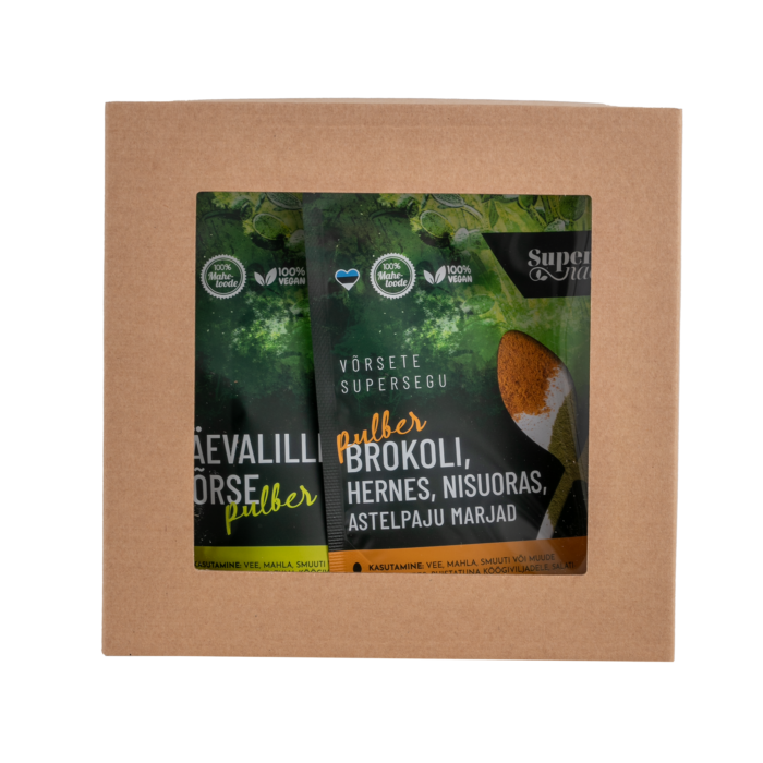 Supernacs kinkekomplekt sisaldab kahte sorti kuivatatud võrsete pulbreid: võrsete supersegu ja päevalille pulber. Kuivatatud võrsete pulbrid on pakitud ilusasse kinkekomplekti. 100% mahetoode, kasvatatud Eestis