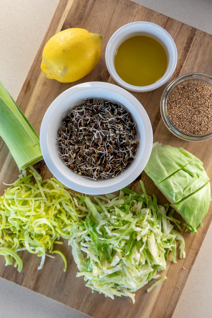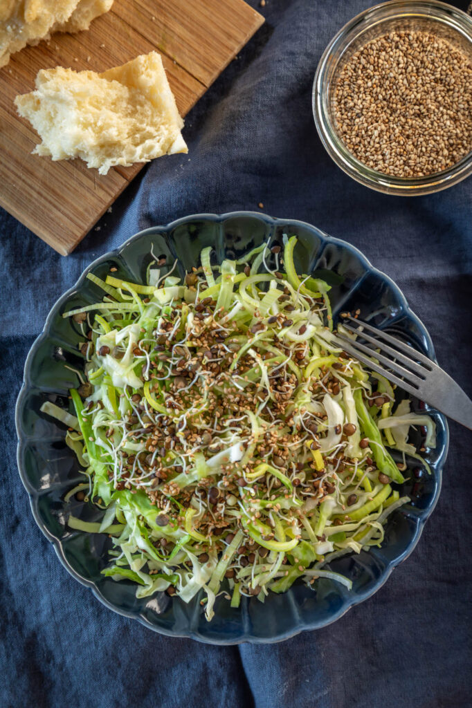 Lõika porrulauk ja peakapsas õhukesteks ribadeks. Sega hulka läätse idandid. Lisa sidrunimahl, õli ja sool ning sega läbi. Puista seesamiseemned kõige viimasena peale. Kui soovid valgurikkamat rooga, lisa salatile näiteks 30g kodujuustu.